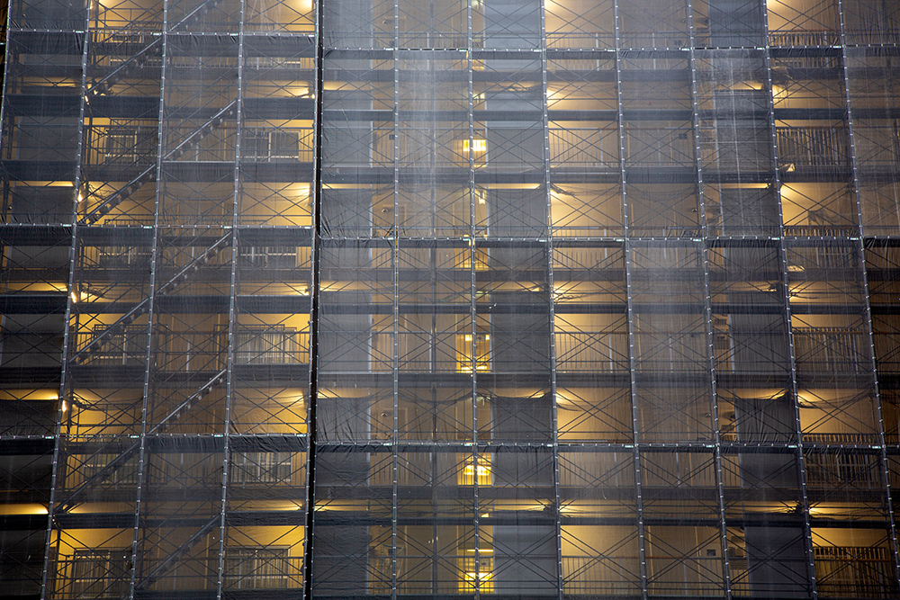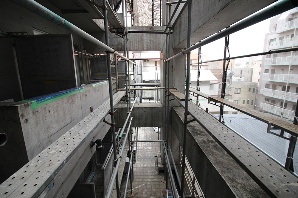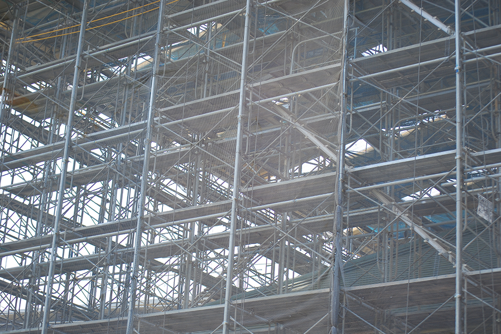 柏木工業では建築現場で使われる足場の組み立ておよび解体を行なっております。また、既存建築物の外壁改修・内装改修などの工事にともなう足場工事にも対応しております。